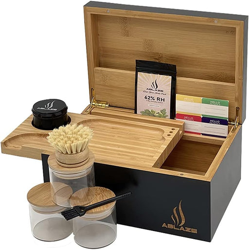 AblazeCustomASIN:B09669RPDN Suggest title : Ablaze Large Bamboo Storage Box with Removable Tray Kit - Decorative Box Set, UV Glass Jars and Brush